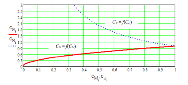 На рис. 2 изображен график зависимости масштабов подобия мощности на валу ЭД от масштаба крутящего момента CN = f(CM) и масштаба угловой скорости CN = f(Cω).