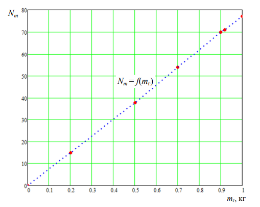 где mг – масса грузиков, кг; Nm – безразмерные показания индикатора тензодатчика, исходя из построенного тарировочного графика (рис. 5).