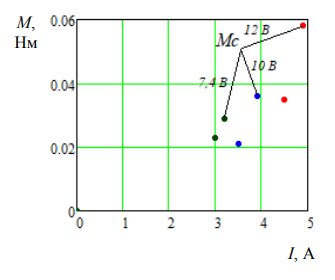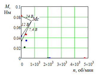 Рис. 17. Опытные данные зависимости I = f(n) для ЭД DC24V на 24, 12, 7,4 В