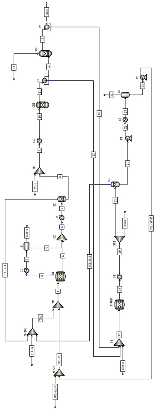TOL-R-1 and TOL-R-2 are toluene recycling streams; SUL-AC-R is sulfuric acid recycling stream; 1–22 – intermediate streams