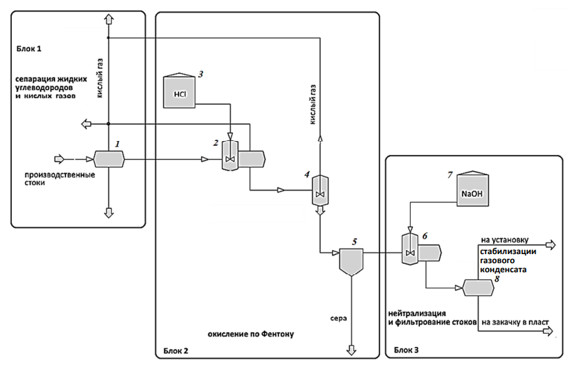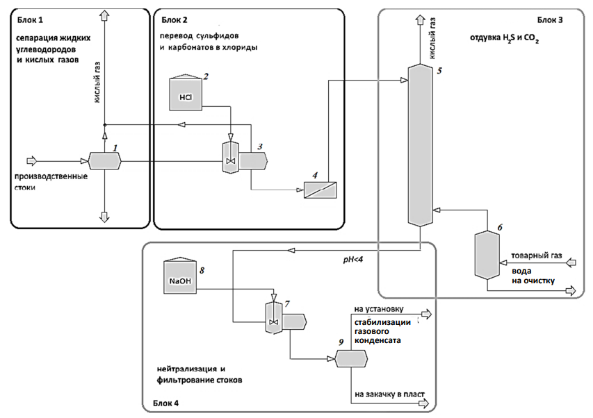 После предварительной сепарации производственных сточных вод от кислых газов и нефтепродуктов в блоке 1 сульфиды и карбонаты, растворенные в воде, превращаются за счет химического взаимодействия с соляной кислотой в хлориды, реакция сопровождается выделением сероводорода и углекислого газа. Сероводород в воде находится в молекулярно-растворенном состоянии либо в виде сульфида S2– и гидросульфида HS-. Для его перевода в молекулярную форму с целью последующего удаления необходимо подкисление воды до рН 5 и ниже [2], для чего используют специальные реагенты – технические кислоты (блок 2), возвратные потоки кислых газов (СО2 и SO2), отходящие дымовые газы. Затем, для того чтобы сместить равновесие в направление газовой фазы, через сероводородсодержащую воду продувают при большой площади массообмена поток газа с низким содержанием Н2S в процессе дегазации (блок 3), либо воду подогревают и осуществляют термическую деаэрацию. Оба метода основаны на физических закономерностях растворения газа в жидкости и в самом грубом приближении описываются законом Генри (растворимость газа прямо пропорциональна парциальному давлению газа, зависит от температуры и давления). В данном случае используется отдувка товарных газов с последующей нейтрализацией стоков гидроксидом натрия (блок 4), т. к. скопление в канализационных колодцах углекислоты может привести к несчастным случаям при ремонте канализационной сети предприятия. Недостатками физических методов являются неудовлетворительное качество очистки воды, использование жестких реагентов (соляной и серной кислот, гидроксида натрия), многостадийность обработки, недостаточная экологичность и сохранение рисков для окружающей среды.