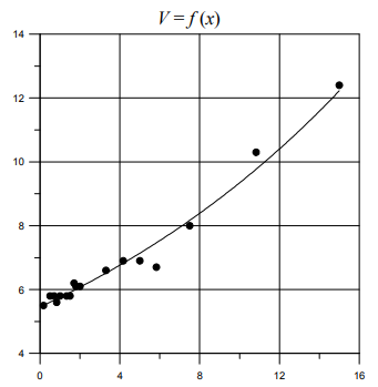 ln(V) = 0,054 · X + 1,696 или V = exp(0,054 · X) · 5,455 Среднее X = 3,71 Среднее ln(V) = 1,89 Остаточная сумма квадратов = 0,021 Сумма квадратов, обусловленных моделью = 0,775 Коэффициент детерминации R2 = 0,97 |