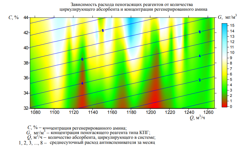 уравнение (8) показывает, что при регламентной температуре куба абсорбера расход пеногасящих реагентов зависит только от производительности установки по обессеренному газу и составляет около 20 мг/м3.