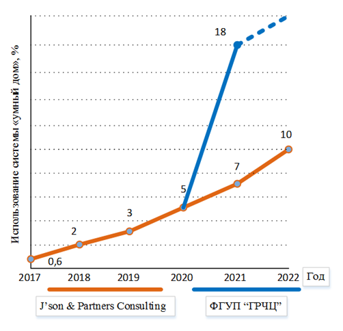 В 2017 г. консалтинговая компания J’son & Partners Consulting провела в России исследование по использованию технологии «умный дом». Согласно результатам исследования только 0,6 % домохозяйств использовали системы на ее основе, а рост проникновения интеллектуальных технологий в 2022 г. составит около 10 %. При этом в исследовании учитываются домохозяйства с наличием так называемых «интеллектуальных устройств» (устройства IoT, взаимодействующие с одной из платформ, например Alexa от Amazon или Алиса от Яндекс), т. е. с неполной автоматизацией (рис. 1).