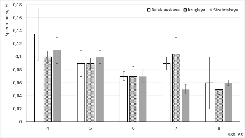 of the bays of Sevastopol led to a decrease in the spleen index for most fish species of the Black Sea [6]. In addition, no significant difference was registered between the values of this index in fish of different sexes [6]. For that reason, in the present work, the data obtained have been broken down into groups by age and habitat area. This breakdown of the data revealed that the spleen index was markedly lower in 7-year-old females from Streletskaya Bay (0.05 ± 0.004%). In age and sex