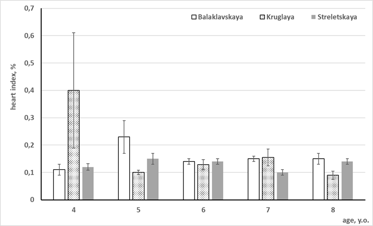 This year, similar results have been obtained when studying this index. In most cases, the heart index was lower for the scorpion fish from Kruglya and Streletskaya bays (Fig. 4).