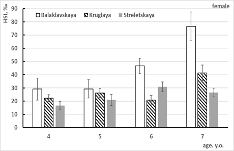 Comparative analysis did not show a significant difference in gill index between fish of different age from all the mentioned water areas (Table 1). The highest values of this parameter were registered among 6- and 7-year-old females from Streletskaya Bay