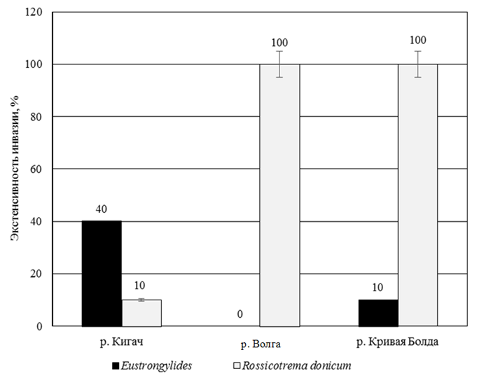 Самым чистым водоемом можно назвать проток Кигач (обнаружено максимальное количество эустронгилид – 19), а самым грязным – р. Волгу (эустронгилиды не обнаружены, количество Rossicotrema donicum – 369).