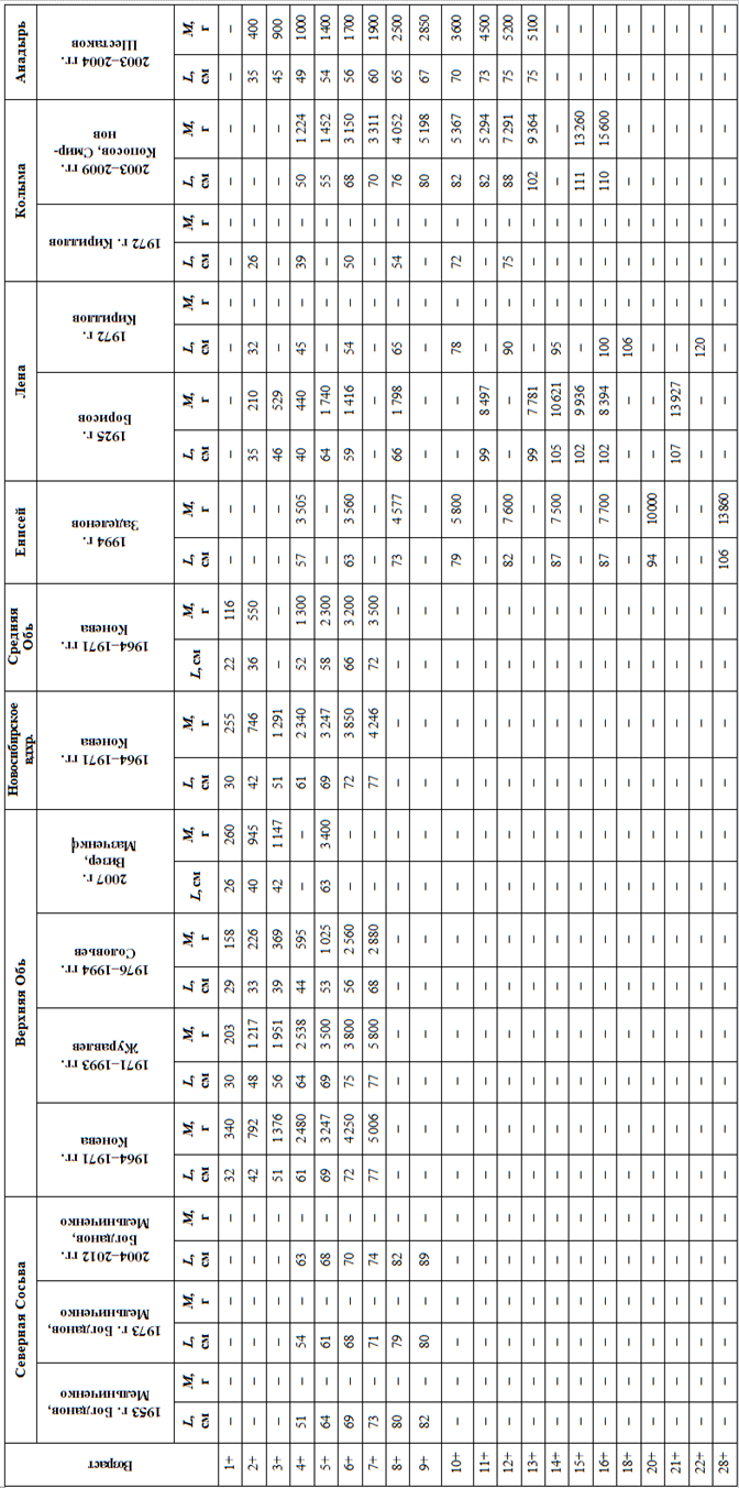 Средние показатели наступления половой зрелости туводной и полупроходной форм Stenodus leucichthys nelma в различных реках в пределах географического ареала (расположение рек с запада на восток) [5, 11, 12, 16, 33]