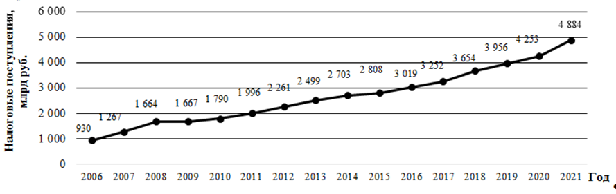 Динамика величины налоговых поступлений по НДФЛ в 2006–2021 гг. приведена на рис. 3 [6].