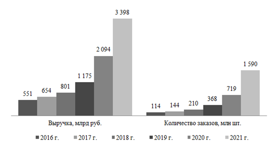 Рис. 1. Выручка и количество заказов 100 крупнейших онлайн-ритейлеров России за период 2016–2021 гг.