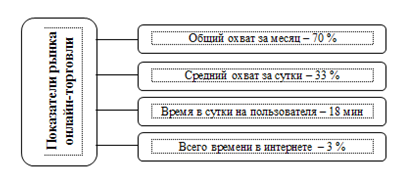 Лидерами отечественной интернет-торговли остаются Ozon, Wildberries, «Ситилинк», «М.Видео», Avito, Lamoda, «Утконос онлайн», а также «Перекресток впрок», «Яндекс Маркет», «Сбермаркет» и др. [3]. В среднем интернет-пользователь тратит на онлайн-шоппинг около 20 мин в день, что составляет 3 % всего времени, проводимого в интернете. Специалистами также исследуется проникновение онлайн-торговли в привычные повседневные покупки по возрастным категориям (рис. 3).