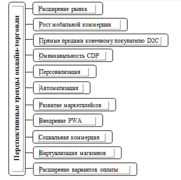 Расширение ассортимента цифровых технологий, изменение покупательского поведения, изменение конъюнктуры рынка, развитие инфраструктуры доставки, финансовых инструментов оплаты приводят к возникновению актуальных трендов электронной торговли, которые нельзя игнорировать, если компания или торговая площадка рассчитывает на успешное и долгосрочное пребывание на своем рынке и в отрасли онлайн-торговли (рис. 4).