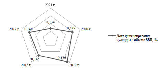 Несмотря на то, что в действующей редакции государственной программы «Развитие культуры» в качестве критерия оценки эффективности финансового обеспечения рассматриваемой сферы нет показателя, отражающего долю затрат на развитие культуры в валовом внутреннем продукте страны, все же данный индикатор считаем значимым. Согласно официальным данным Федеральной государственной службы статистики по объему ВВП в стране, а также информации по объемам финансирования учреждений культуры в 2017–2021 гг., в работе приведена оценка данного показателя (рис. 6).