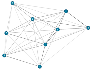 Предложения, которые имеют общие слова, оставляют, и строится граф, в котором вершины представляют собой предложения статьи, а ребра показывают наличие одинаковых слов с соответствующими коэффициентами (весами) из предыдущего пункта алгоритма. В примере, представленном на рис. 2, отсутствует предложение 1, т. к. оно не имеет общих значимых слов с другими предложениями.