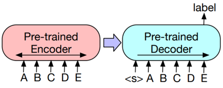Целью обучения является задача реконструкции текста. Перед подачей данных в модель часть токенов маскируется (заменяется на токен [MASK]), часть удаляется. В основе этой модели лежит концепция Seq2Seq, в качестве энкодера выступает модель BERT, а качестве декодера – GPT-2. Архитектура работы модели представлена на рис. 10.