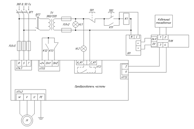 Для того чтобы запустить ПЧ, необходимо нажать кнопку SB2 [7], в результате чего питание поступит на катушку реле K1 (после чего замкнутся контакты K1.1 (обеспечивающий постановку K1 под напряжение) и K1.2 (подающий команду на включение ПЧ) и разомкнется контакт K1.3 (в случае потери питания на K1 на ПЧ будет сигнал об отключении)) и на блок питания (БП), предназначенный для преобразования переменного напряжения (220 В) в постоянное напряжение (24 В), которое будет подаваться на ПЛК.