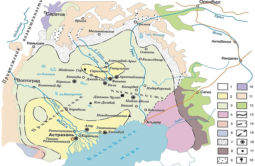 16 – deposits of natural gases; 17 – gas shows in wells; 18 – gas shows in wells and inspection reservoirs