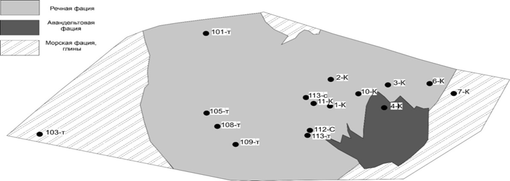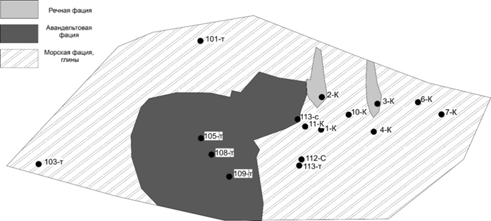 1 – области отсутствия отложений; 2 – преимущественно глинистый комплекс; 3 – песчано-глинистый комплекс;