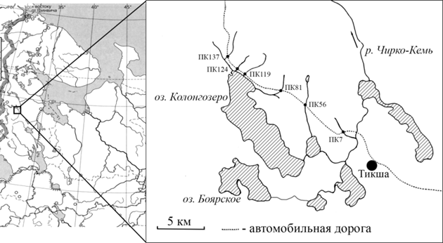 Исследование реакции сообществ макрозообентоса на техногенное влияние, связанное с ремонтными работами (отсыпка дороги и установка водопропускных труб под дорожное полотно), проводили на примере малых водотоков в зоне северной тайги на территории Республики Карелия (север европейской части России). Отбор проб проведен 06 сентября 2022 г. непосредственно после окончания дорожных работ на объекте. Карта-схема региона исследований и расположения обследованных водотоков представлена на рис. 1, координаты мест отбора проб и названия водотоков приведены в табл. 1.