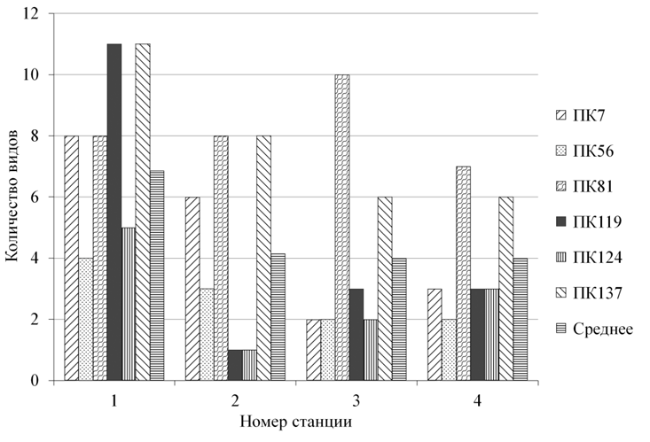 Обилие макрозообентоса в зоне работ (ст. 2–4) снижается по сравнению с «фоновыми» значениями (ст. 1) во всех водотоках, кроме Ручья без названия на пикете ПК 81, где при ремонте дороги установку трубы не производили, а оставили уже имеющуюся. В связи с этим нарушения грунта на пикете ПК81, по всей видимости, были меньше,