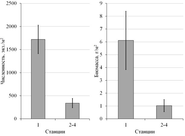 Рис. 3. Сопоставление средних значений численности и биомассы макрозообентоса