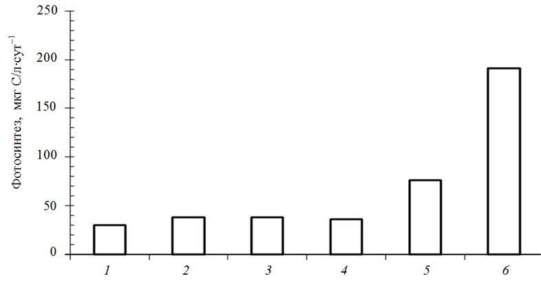 В Лижемской губе (ст. GL2, GL3) (см. рис. 1) средняя величина САЧ летом (по двум значениям) составила 18,4 мкг С/мкг Chl·сут–1, что было выше верхнего предела, установленного для Уницкой губы, Повенецкого залива и Кижских шхер, поэтому восстановление величины фотосинтеза по единственному значению хлорофилла на ст. GL3