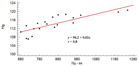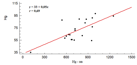 Рис. 2. Зависимость содержания ртути в тканях моллюсков (Hg) от ее концентрации в придонном слое воды (Hgв.в):