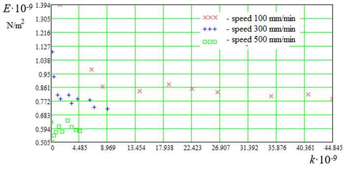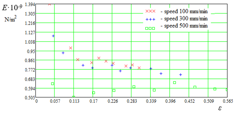 According to formula (15), we obtain the following values of longitudinal modulus of elasticity: E100 = 0.8 GPa; E300 = 0.72 GPa and E500 = 0.65 GPa.