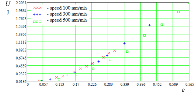 E = f(ε, v), E = f(k, v) and U = f(ε, v) of polyamide thread d = 0.45 mm before the thread rupture (Fig. 5-7).