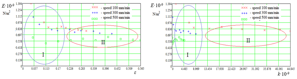 Fig. 8 (a, b) shows the calculated data E = f(ε, v) and E = f(k, v) and loading areas I and II, where it can be seen that in area I there is a strong change in E, while in area II there is no. This is due to the densification of the molecules in region I. The correction factor k corresponds to
