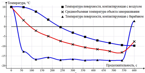 Согласно представленной схеме икорный продукт толщиной 5 мм, имеющий начальную температуру Тнач = 10 °С, при контакте с поверхностью вращающегося барабана, имеющей температуру Тпов = –18 °С, начинает замораживаться. Отметим, что объект консервирования с другой стороны контактирует с воздушной средой, имеющей температуру Тсреды = 20 °С, которая выше Тнач, что оказывает негативное влияние на скорость замораживания икры. Заметное преобладание отводимой тепловой энергии Qохл от продукта заморозки над подводимой к продукту теплотой от внешней воздушной среды Qср в итоге приводит к желаемому результату, и по прошествии некоторого времени в икре достигается заданная среднеобъемная отрицательная температура Tкон.