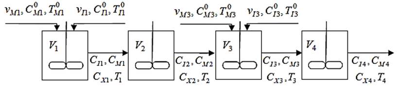 4-х аппаратов идеального смешения для описания каждой из 4-х зон реактора. Схема потоков в зонах реактора показана на рис. 2.