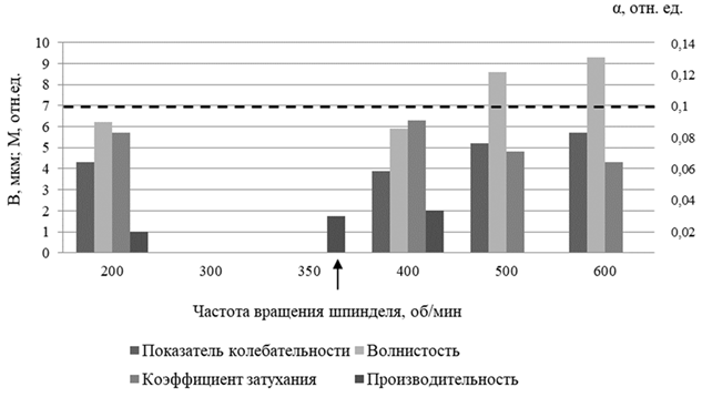 Традиционно обработка колец на станке ПАБ-350 осуществлялась при частоте вращения шпинделя 350 об/мин. В экспериментах при частотах вращения 200 и 400 об/мин измерено по 3 кольца и вычислены средние значения волнистости. На частотах вращения 500 и 600 об/мин уровень вибраций существенно повысился, снизился запас устойчивости ДС (повысился показатель колебательности и снизился коэффициент затухания) и волнистость превысила допустимый уровень, поэтому было обработано только по одному кольцу и производительность не оценивалась. Результаты измерений показали, что на частоте 400 об/мин обеспечивается волнистость поверхности, не превышающая заданную, а производительность выше на 20 % по сравнению с существующим режимом, т. е. более целесообразной является обработка колец с указанной частотой вращения шпинделя.