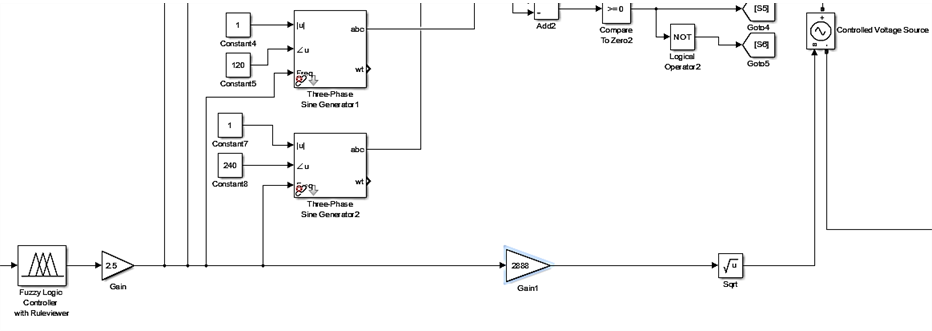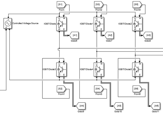 Силовой блок представляет собой 6 блоков IGBT/Diode, с которых переменное напряжение поступает на АДКЗ, а также блок Controlled Voltage Source. Блок управления представляет собой 4 блока Tree-Phase Sine Generator, а также набор блоков Goto и From, предназначенных для передачи сигналов для управления диодами.
