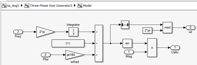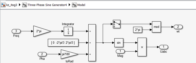 На вход │u│ подается сигнал, задающий величину выходного сигнала с блока Tree-Phase Sine Generator. На вход < u подается сигнал, задающий начальный угол синусоиды. На вход Freq подается сигнал, задающий частоту синусоиды.