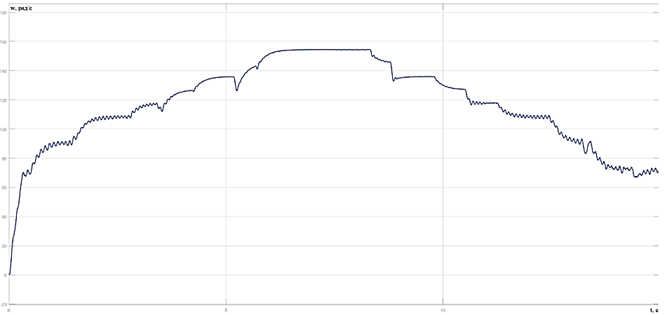 На графике есть 8 участков увеличения скорости вращения и снижения скорости вращения. Изменение скорости вызвано изменением величины сигналов, поступающих с датчиков, и происходит в соответствии с прописанной программой управления.