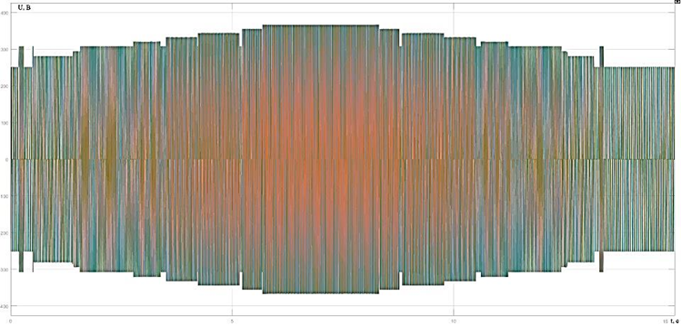– блоки Gain и Sqrt для преобразования сигнала с блока Gain с коэффициентом 2.5 в величину напряжения, в соответствии с законом скалярного управления ПЧ U ^ 2 / f = const (рис. 19).