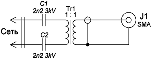 C1, C2 – capacitors (capacity 2,2 nF, voltage 3 kV); Tr1 – transformer (number of turns 1:1); J1 – SMA connector