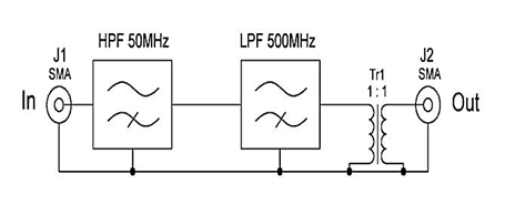 J1, J2 – input and output SMA connectors; HPF – high pass filter; LPF – low pass filter
