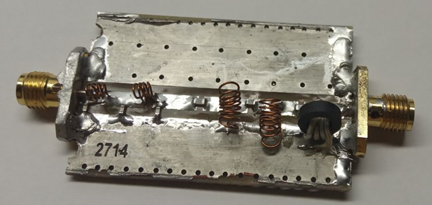 Далее произведена распайка компонентов полосового фильтра и произведена подстройка характеристик полосового фильтра деформацией, изменением числа витков катушек и подбором емкости конденсаторов. Внешний вид налаженного макета фильтра приведен на рис. 7.