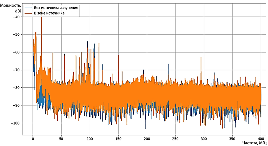 Первый этап – получение разностной картины по описанному на рис. 10 алгоритму – позволяет фиксировать факт наличия электромагнитного излучения, создаваемого вычислительной техникой, и регистрировать его частоты на штыревую антенну SDR-системы. Результат анализа частотного диапазона от 1 до 400 МГц представлен на рис. 11.