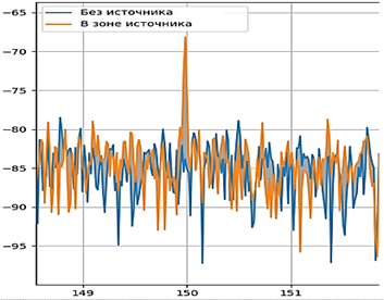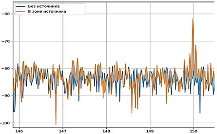 Если подробнее рассмотреть участок около частоты 150 МГц, то можно заметить значительное различие усредненных уровней между двумя измерениями, что позволяет предполагать наличие исследуемого излучения на этой частоте (рис. 13).