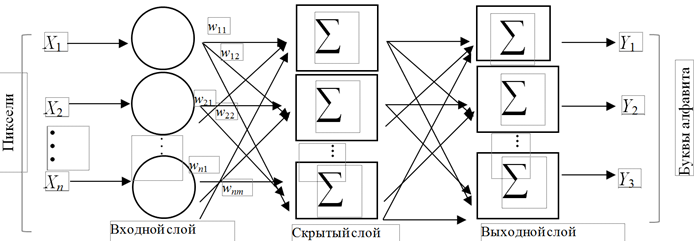 На вход нейросети подаются пиксели изображения, т. е. данный слой состоит из n × m нейронов, где n – высота изображения, а m – ширина. Выходной слой состоит из k нейронов, где k – размер используемого алфавита. Для каждого слоя, кроме первого, входным параметром будет являться выходной вектор предыдущего слоя.