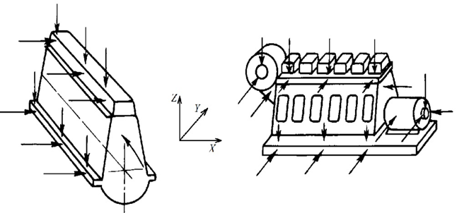 Рис. 1. Точки измерения вибрации и система координат главного двигателя (а) и дизель-генератора (б)
