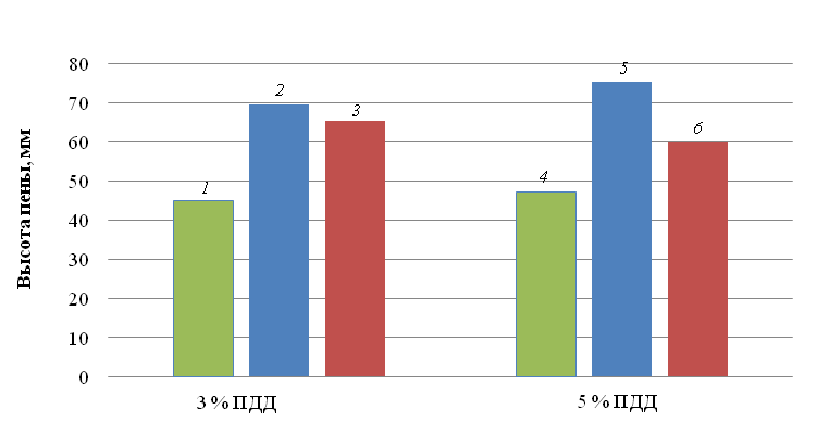Подобным образом значительное влияние оказывают ПДМ: высота пены увеличилась более чем в 1,7 раза, а стабильность пены – в 11 раз.