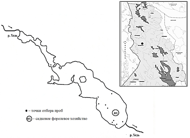 Цель исследований: оценка современного состояния экосистемы оз. Хедо в условиях длительного садкового производства радужной форели.