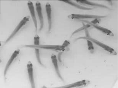 After 20 days of hatching the larvae were more than 8 mm in length. The diet during this period contained adult daphnia (50%), up to 900 µm in size, and artemia metanauplius (50%), up to 850 µm in size.