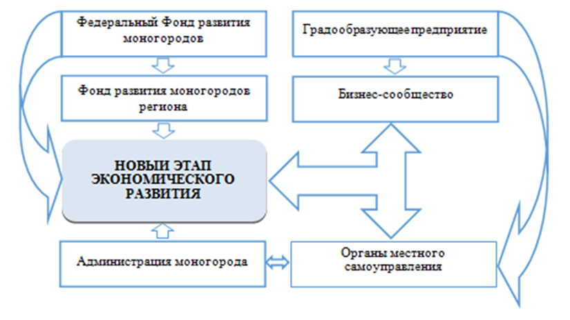 Достижение данных ориентиров, по нашему мнению, предопределяет активное государственное регулирование в привлечении необходимых ресурсов, их эффективном использовании в реализации конкурентных потенциалов и возможностей моногородов и их градообразующих предприятий. Кроме того, органам государственного управления на федеральном и региональном уровнях посредством перераспределительных механизмов необходимо снять излишнюю нагрузку с градообразующих предприятий по содержанию социальной и инженерной инфраструктуры.