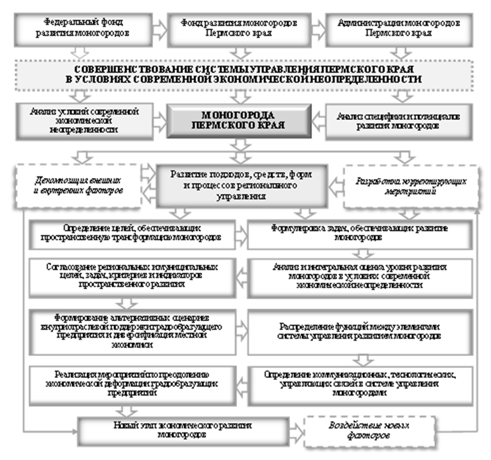 На рис. 3 представлено наше видение системы управления региона, определяющей новый этап пространственного развития моногородов Пермского края в условиях современной экономической неопределенности.